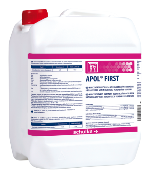 apol® first je určený k dezinfekci a mytí vemen před dojením. Je určen k přímé aplikaci roztoku na vemeno (metoda dipování), nebo k použití spolu s papírovými nebo textilními utěrkami. Také je vhodný pro dezinfekci strukových návleček a pro praní opakovaně použitelných utěrek