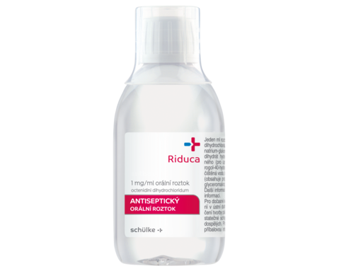 Důležité informace pro uživatele: • Riduca - antiseptický orální roztok • Složení: 1 ml roztoku obsahuje octenidini dihydrochloridum 1 mg. • Indikace: K dočasnému snížení počtu bakterií v ústní dutině, k dočasnému omezení tvorby plaku, v případech nedostatečné schopnosti ústní hygieny. • Kontraindikace: Hypersenzitivita na léčivou látku nebo na kteroukoli pomocnou látku. • Dávkování a způsob podání: Orální podání. Přípravek je určen pouze pro povrchové použití. Ústní dutina se má vyplachovat po dobu 30 sekund pomocí 10 ml roztoku dvakrát denně. Po vypláchnutí ústní dutiny se má roztok vyplivnout. Tento léčivý přípravek nepoužívejte déle než 5 po sobě jdoucích dní. • Interakce: Oktenidin-dihydrochlorid může reagovat s aniontovými látkami, které se obvykle vyskytují v běžných zubních pastách, proto má být Riduca použita v jiné denní době, než si pacient čistí zuby. Riduca se nemá používat současně s přípravky určenými k použití v ústní dutině, které obsahují jodovaný povidon, protože to může vyvolat vznik fial vých nebo hnědých skvrn v ústech a může to způsobit místní podráždění. • Nežádoucí účinky: dysgeuzie, dočasné zabarvení jazyka. U některých subjentů bylo navíc pozorováno mírné a reverzibilní zabarvení zubů. • Upozornění: Před použitím si důkladně přečtěte příbalovou informaci. • Výrobce / Držitel registračního rozhodnutí: Schülke & Mayr GmbH, Robert-Koch-Str. 2, 22851 Norderstedt, Německo. • Registrační číslo: 95/331/19-C. • Adresa v ČR: Schulke CZ, s.r.o., Lidická 445, 735 81 Bohumín, tel.: +420 558 320 260, e-mail: schulkecz@schuelke.com. • Datum poslední revize textu: 09/22
