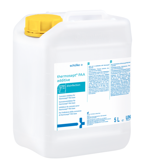Die Komponenten base und additive dürfen nur zusammen angewendet werden. Im Originalbehälter bei Raumtemperatur lagern. Behälter dicht geschlossen halten. Vor Hitze und Sonneneinstrahlungen schützen. thermosept® PAA ist nicht geeignet für Instrumentarium aus Messing und Kupfer, sowie verchromte Instrumente. Gem. EN 17664 sind die Instrumentenherstellerangaben zu beachten und die Materialverträglichkeit ggf. vor der Anwendung sicherzustellen. Dies gilt insbesondere bei der Aufbereitung älterer Endoskope. Diese sollten grundsätzlich auf die Verträglichkeit mit Peressigsäure bewertet werden. Nur für den professionellen Gebrauch. Vor Gebrauch stets Etikett und Produktinformationen lesen.