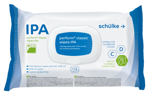 Desinfektionsmittel vorsichtig verwenden. Vor Gebrauch stets Etikett und Produktinformationen lesen. Nur für industrielle/ berufsmässige Anwender. Der in perform® classic wipes IPA enthaltene Alkohol entspricht der pharmazeutischen Qualität gemäss Ph. Eur. EU-0023656-0002 1-2