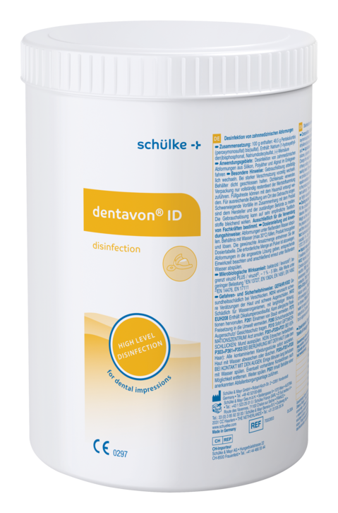Vor Gebrauch stets Etikett und Produktinformationen lesen. Bei der Desinfektion von Abformungen mit dem Produkt sollte auf die Einhaltung der vorgegebenen Einsatzkonzentration sowie die vorgegebene Einwirkzeit im Tauchbad besonders geachtet werden. Das Tragen von Handschuhen ist erforderlich. Die Gebrauchslösung kann auf empfindliche Textilien bleichend wirken. Behälter dicht geschlossen halten. Vor Frost, Hitze und Sonnenbestrahlung schützen. Im Originalbehälter bei Raumtemperatur lagern. Verpackung nur vollständig restentleert der Wertstoffsammlung zuführen. Füllgutreste können mit dem Hausmüll entsorgt werden. Für ausreichende Belüftung am Ort des Gebrauchs sorgen. Ausschliesslich für die Verwendung von Fachkräften bestimmt.