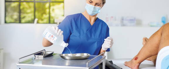 Eine Wundreinigung sollte im Rahmen des Verbandwechsels immer durchgeführt werden. Richtig eingesetzt unterstützen Wundspüllösungen das chirurgische Debridement.