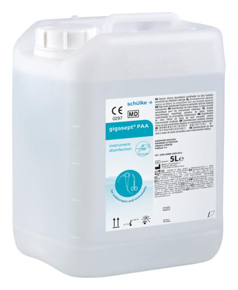 gigasept® PAA is a ready to use product. gigasept® PAA is active immediately and stable over 7 days or 50 cycles of disinfection. The peracetic acid (PAA) concentration in solution can be tested using Schülke PAA test strips. In case of visible contamination, the bath should be renewed. Always ensure the pre-cleaning of the endoscope and medical instruments and a complete wetting of the surfaces. Immerse hollow objects in such a way that air escapes completely from the lumen. After the necessary contact time rinse carefully with sterile or filtered water before re-use. Do not exceed the recommended contact time. A located ventilation over the bath is recommended. Cover the bath of gigasept® PAA as often as possible. Do not dilute gigasept® PAA. Do not mix with other products (cleaner, disinfectants, etc.), particularly with aldehydes or derivates of halogens (e.g. glutaral, sodium hypochlorite, etc.). Do not use after expiry date.
