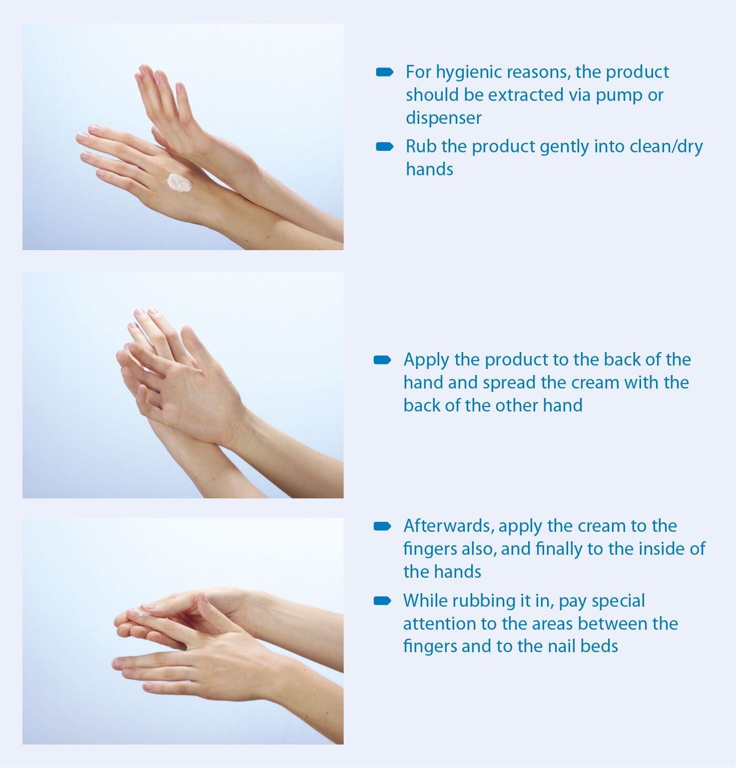 Apply and rub in gently after cleaning/disinfection or as required. Apply to back of one hand and use the back of your hand to spread the cream to the back of your other hand and then also to the palms of the hands.