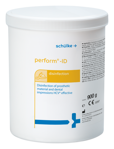 Rinse the prosthetic material and impressions under running water. Dissolve 2 level measuring scoops of perform® ID by scattering it in 2 litres lukewarm water (= 2 % solution). Place the prosthetic material and impressions in the solution, leave to react for 15 minutes and then rinse the pieces again under running water. Wrap the impression in damp gauze and seal in a plastic bag, mark clearly that the impression has been disinfected. In line with the COSHH regulations 2002 the responsibility for ensuring impressions and appliances have been cleaned and disinfected prior to dispatch to the laboratory lies solely with the dentist. Used in the way described above perform® ID is also suitable for disinfecting worn dentures, dental work pieces and prosthetic materials.