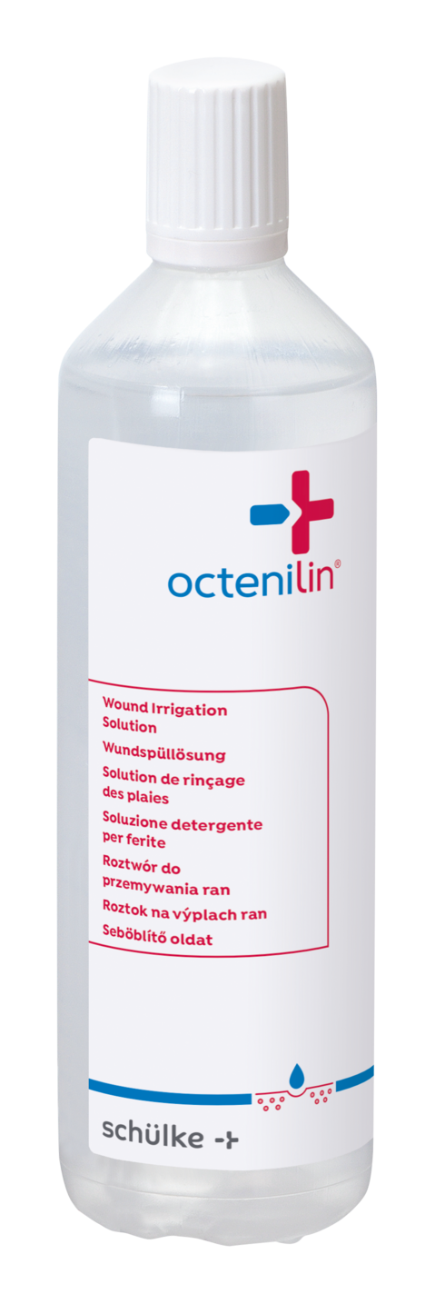 A chaque changement de pansement, bien nettoyer et rincer la plaie avec octenilin® Solution de rinçage des plaies (octenilin® Solution de rinçage des plaies peut être amenée à la température corporelle directement avant l'emploi). Les croûtes se détachant facilement peuvent être déjà éliminées de cette manière. Pour détacher les dépôts de fibrine, il est également possible d'utiliser des pansements ou compresses imbibés de octenilin® Solution de rinçage des plaies. Un rinçage ultérieur n'est pas nécessaire. Au besoin, la plaie peut être traitée avec octenilin® Gel pour les plaies.