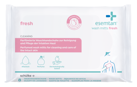 Nettoyer la peau avec le gant. Veiller à bien mouiller la peau, en particulier au niveau des aisselles, entre les doigts et les orteils, ainsi que dans les autres plis cutanés. Il n'est pas nécessaire de rincer à l'eau. Si nécessaire, l'emballage peut être réchauffé au micro-ondes (30 secondes/600W) ou dans une armoire chauffante (+51 °C / 5 jours). Ouvrez délicatement le softpack et retirez un esemtan® wash mitts fresh selon vos besoins. À utiliser uniquement pendant une période limitée. Un gant par zone du corps.