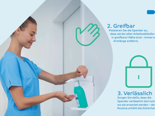 Our motto for 2025: "Within your reach". Why? It's simple: studies [1] show that we are more likely to use disinfectants if they are clearly visible and within easy reach. The WHO recommends placing dispensers at "an arm's length" [2] so they become a matter of course in our everyday lives.
