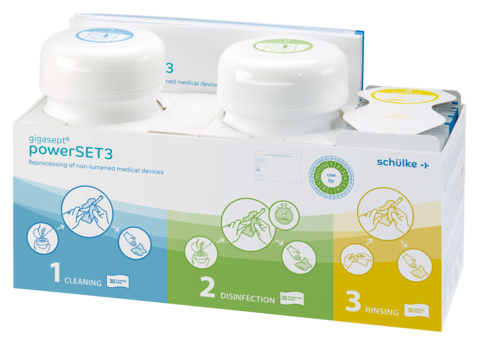 The gigasept® powerSET3 is used for manual reprocessing of the following non-lumened medical devices: transvaginal and transrectal ultrasound probes, transoesophageal echocardiography (TEE/TOE) probes, non-invasive ultrasound probes and flexible endoscopes without channels (e.g. nasopharyngoscopes). The product consists of three components that are used in three successive steps and thus represent a complete reprocessing cycle: